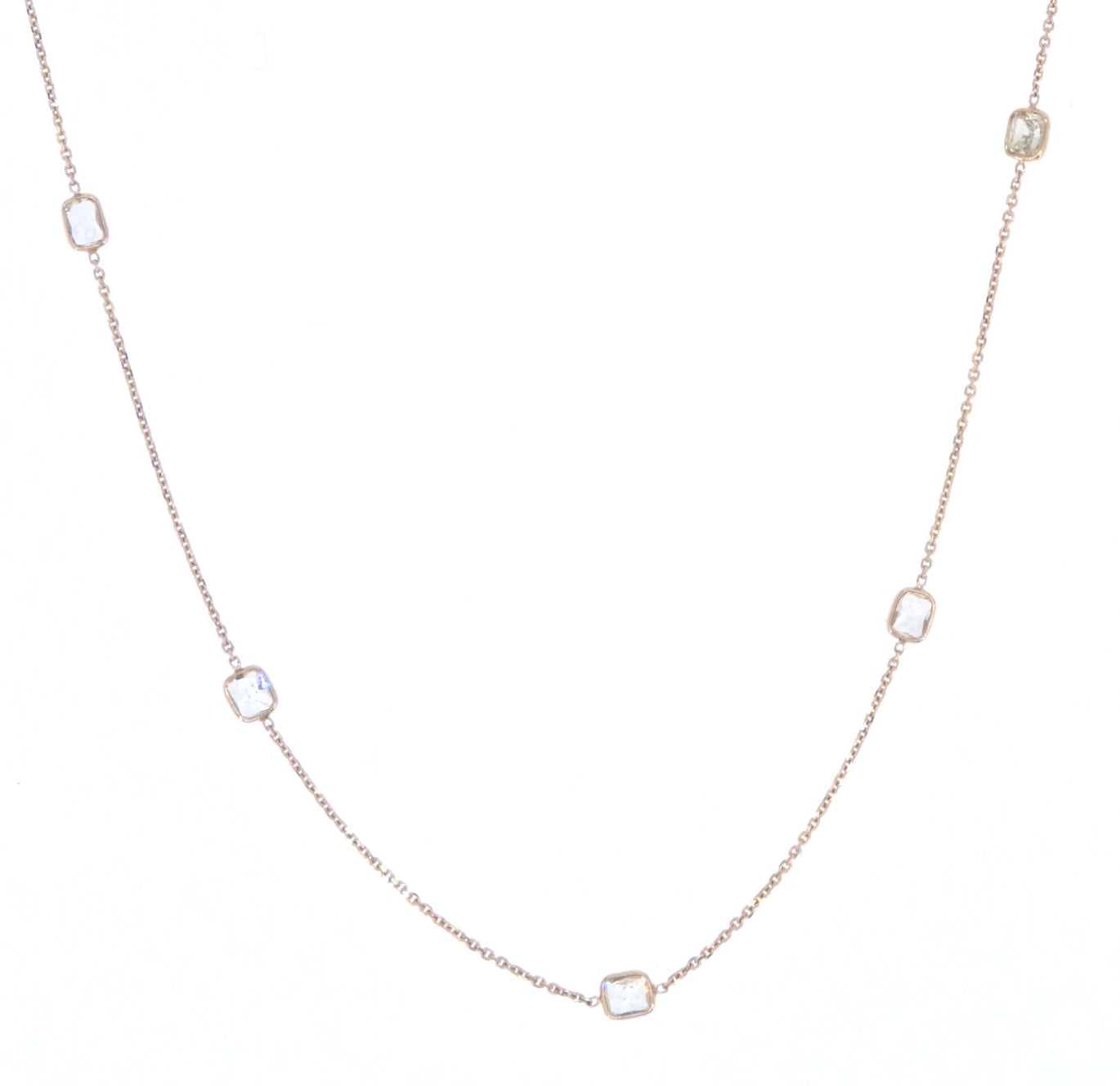 A sleek everyday gold necklace adorned with five natural cushion-shaped diamonds.