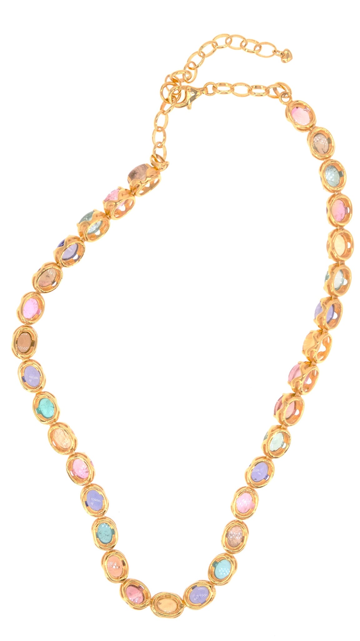 This necklace features gorgeous natural oval cabochon tourmalines, glowing with rich forest-fruit tones - raspberry, blackberry, mossy green, lagoon blue and soft plum.