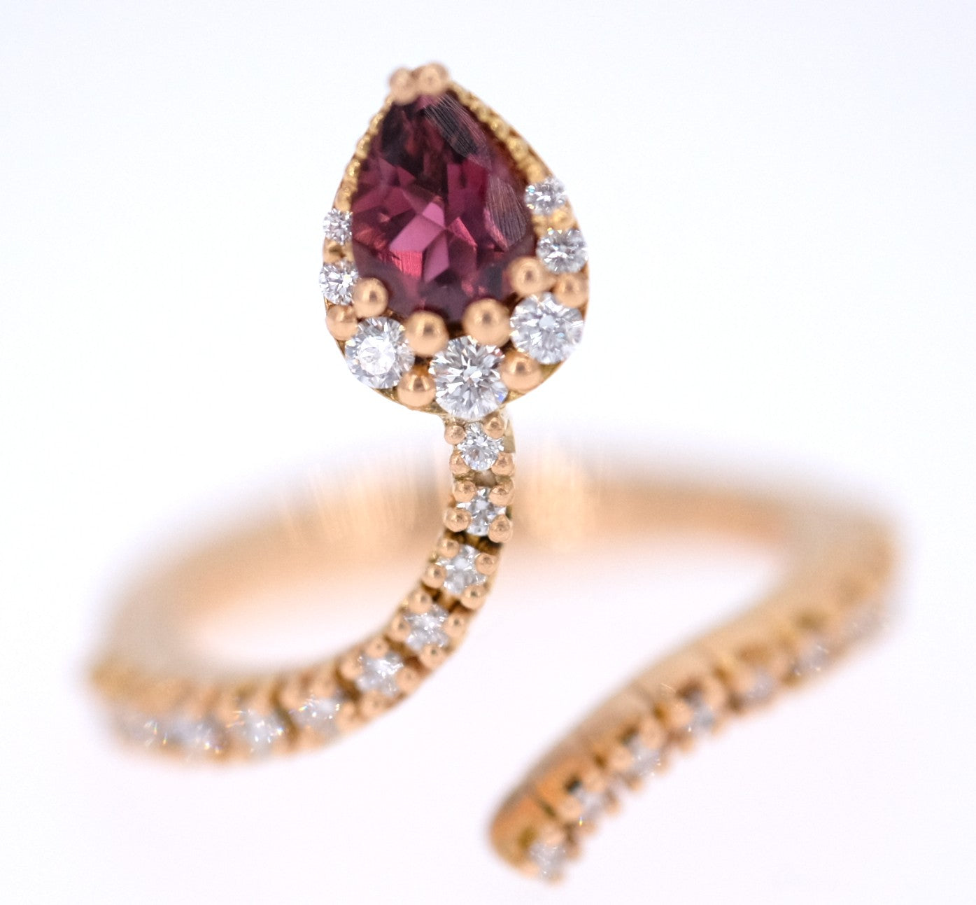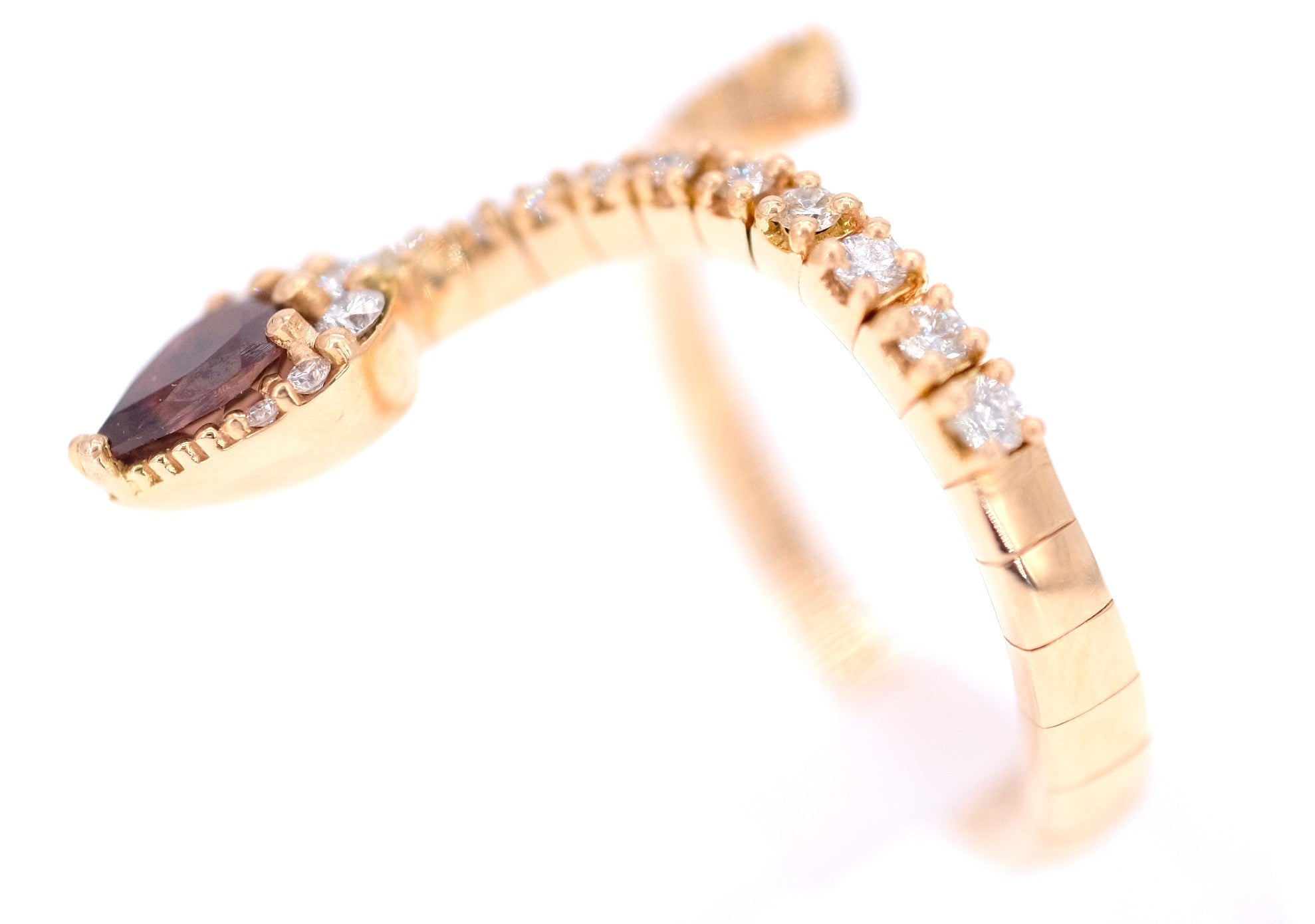 Inspired by nature and this gorgeous animal mesmerizing jewellery designers and legends since centuries we created this gold ring in the shape of a cobra, set with twenty seven natural round diamonds and one central natural pear shape dark pink tourmaline.