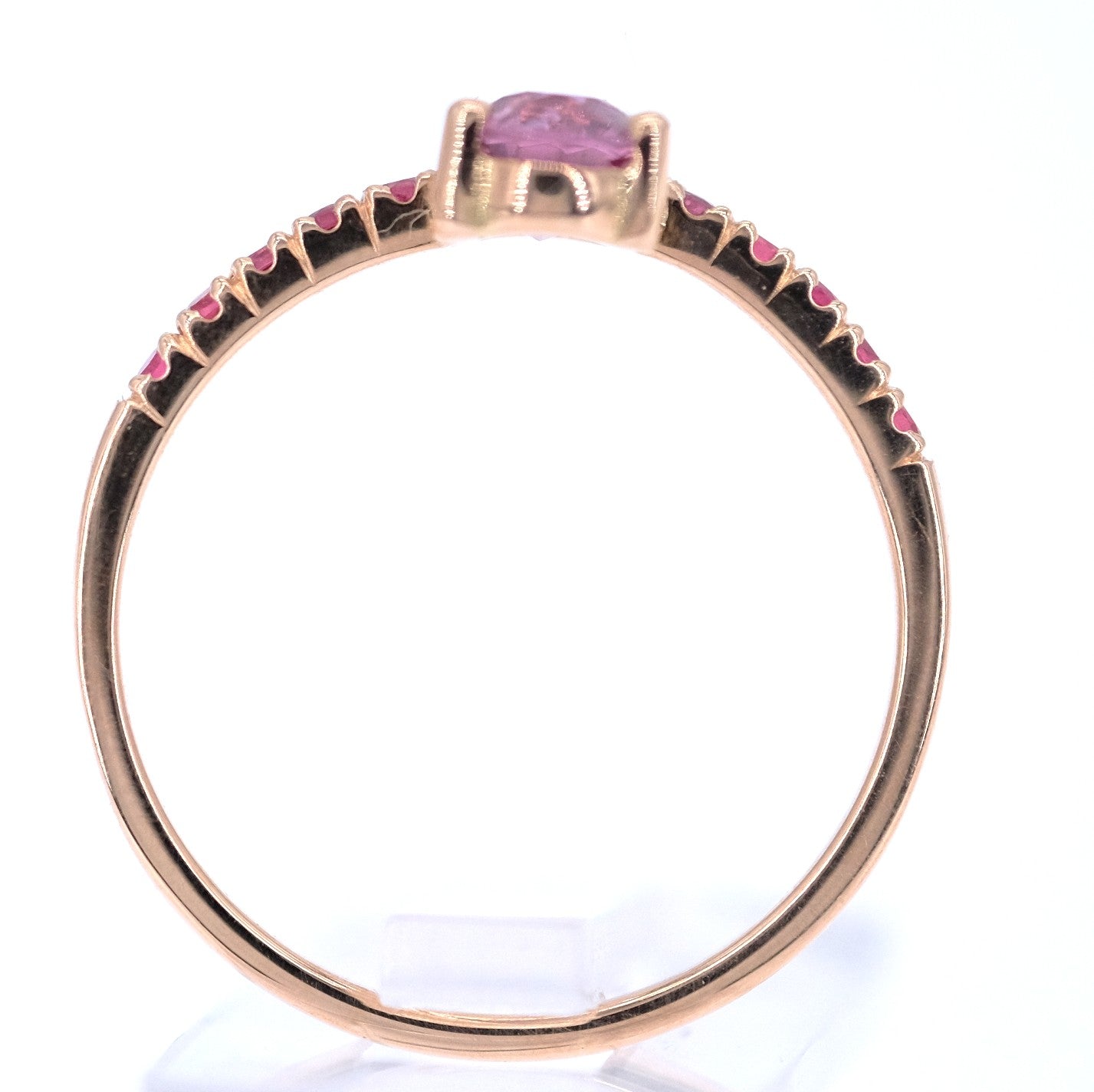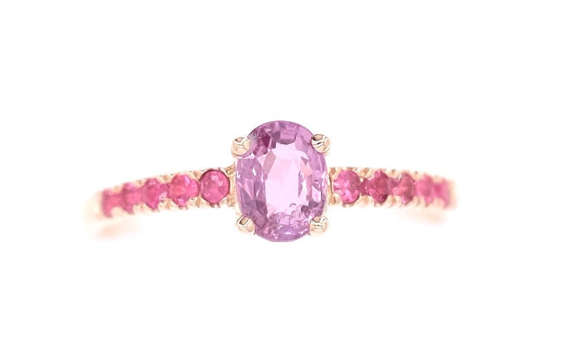 Cute little rose gold ring set with a central natural roundish oval pinkish violet spinel and ten small natural no heat pink spinel.